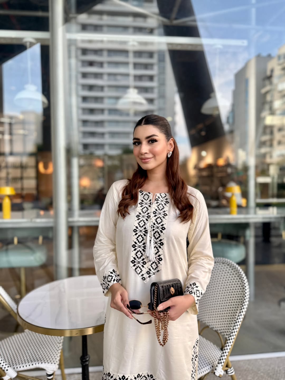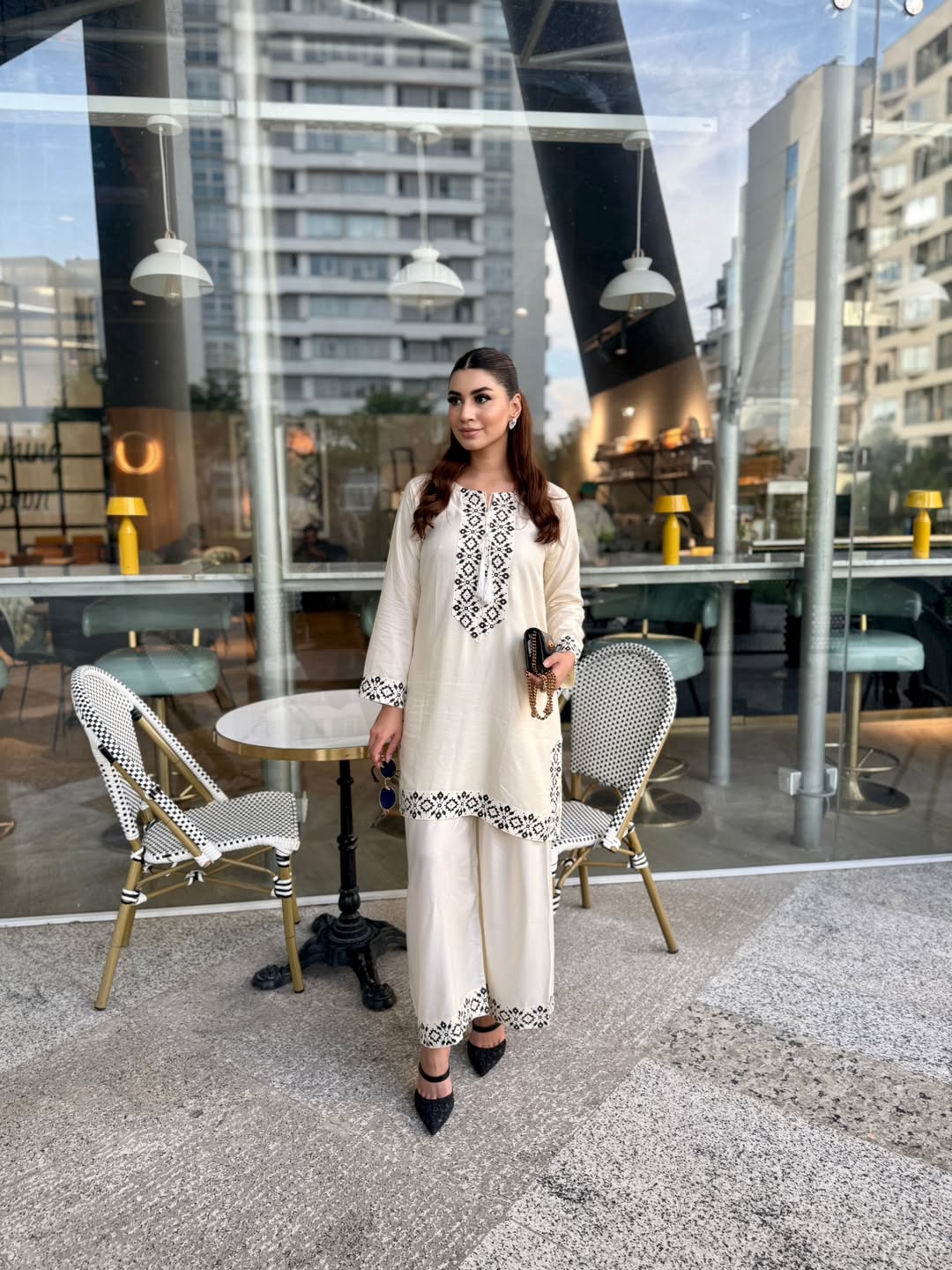 Elegant 2-piece off-white suit featuring black embroidered details on neckline, sleeves, hem, and trouser border. Made from premium breathable fabric, perfect for casual and semi-formal wear.