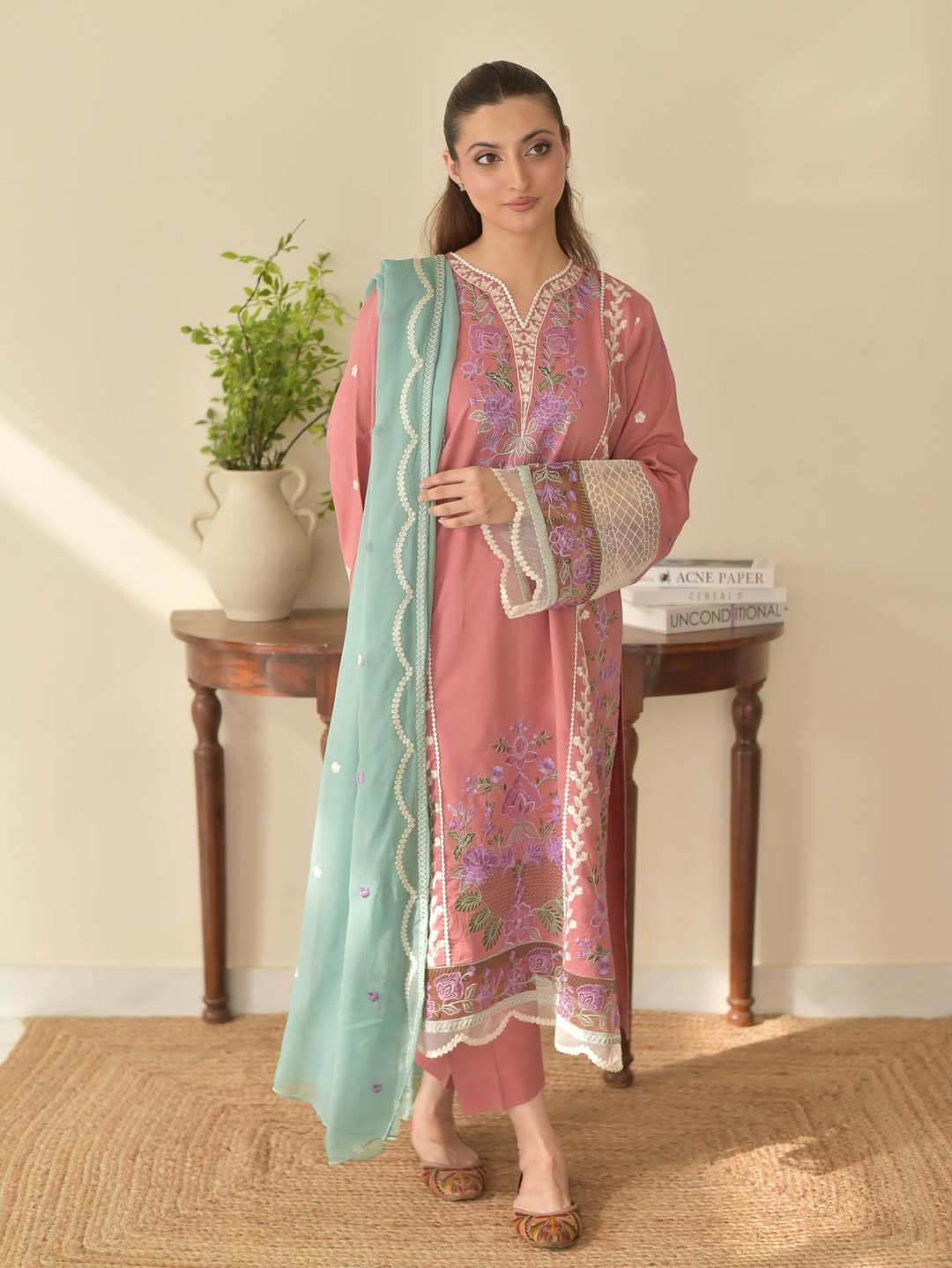 Elevate your style with this elegant 3-piece embroidered Cotton suit in a soft blush pink shade. Adorned with delicate floral embroidery and paired with a refreshing aqua dupatta, this outfit perfectly blends grace and sophistication. Ideal for casual gatherings and festive occasions alike.